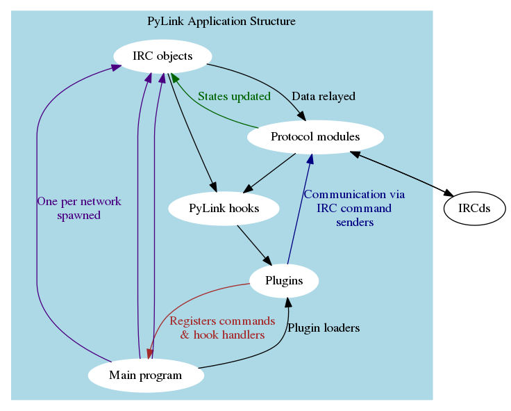 # PyLink Developer Documentation Please note that as PyLink is still in its development phase, its APIs are subject to change. Any documentation here is provided for reference only. The docs are also really incomplete (contributors welcome!) ## Introduction PyLink is an a modular, plugin-based IRC services framework. It uses swappable protocol modules and a hooks system for calling plugins, allowing them to function regardless of the IRCd used. ## Contents - [Writing plugins for PyLink](writing-plugins.md) - [PyLink hooks reference](hooks-reference.md) - [Services bot API/Creating your own service bots](services-api.md) - [Permissions API Introduction](permissions-api.md) - [Using `utils.IRCParser()`](using-ircparser.md) ---- - [PyLink protocol module specification](pmodule-spec.md) - [Supported named channel modes](channel-modes.csv) - [Supported named user modes](user-modes.csv) ---- - [Release Process for PyLink](release-process.md) ### Future topics (not yet available) - [Writing tests for PyLink modules](writing-tests.md)