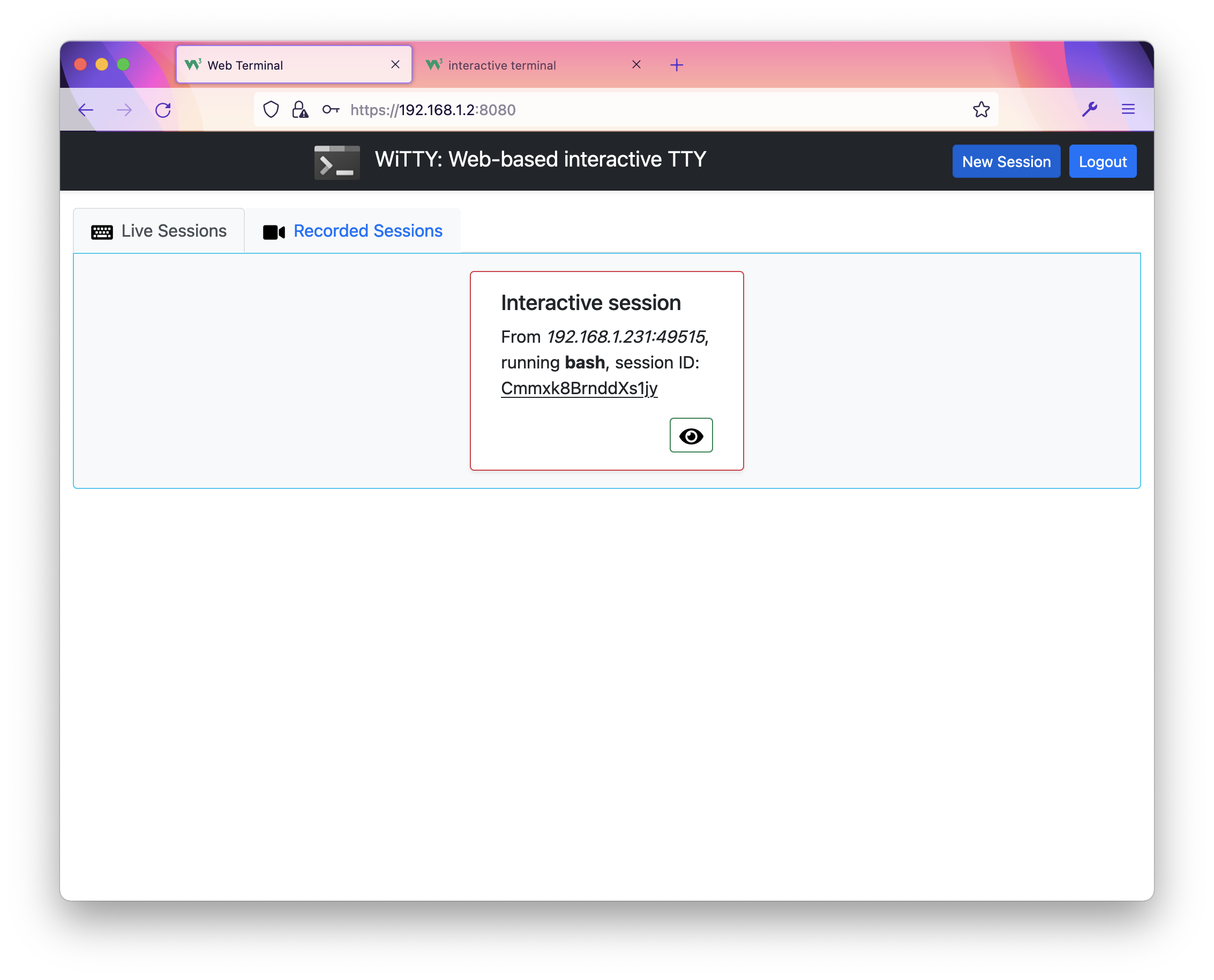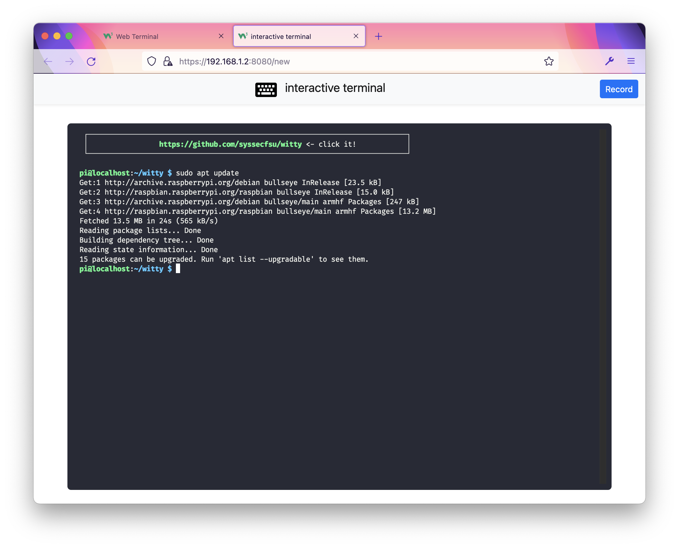 **WiTTY: Web-based interactive TTY** # Introduction This program allows you to use terminal in the browser. Simply run the program and give it the command to execute when users connect via the browser. The design goal of this tool is to help teaching courses that use Unix-like CLI environment. WiTTY has the following features that distinguish itself from other similar tools: 1. WiTTY allows users to **easily record, replay, and share console sessions** with just a few clicks. This make it a breeze to answer course-related questions. Instead of wall of text to describe their questions, students can just send a recorded session. 2. It allows others to **view ongoing interactive sessions**. This is useful for providing live remote help. >A challenge of this use case is that our home networks are almost always behind NAT, making it difficult to run WiTTY as a publicly accessible server. Security is also potentially a concern. 3. Great attention has been paid to ensure the cleanses of the code. This, hopefully, provides a useful example of **Do as I say and as I do**. # User Interface You can use WiTTY to run any command line programs, such as ```bash```, ```htop```, ```vi```, ```ssh```. This screenshot shows the main page of WiTTY after login. There are two tabs that list live and recorded sessions, respectively. You can click ```New Session``` to create a new interactive session. Click the icon of an interactive session opens a read-only view of that session. On the interactive terminal window, you can record an ongoing session. This screenshot shows three recorded sessions, you can replay , download , rename , and delete recorded sessions. Here is a recorded session, where we domonstrate how to use the command line replay utility (in ```cmd/replay```) to replay another recorded session that sshes into a Raspberry Pi running [pi-hole](https://pi-hole.net/). You can fully control the playback using the progress bar. >The inception is strong with this one!        This program is written in the [go programming language](https://go.dev/), using the [Gin web framework](https://github.com/gin-gonic/gin), [gorilla/websocket](https://github.com/gorilla/websocket), [pty](https://github.com/creack/pty), and the wonderful [xterm.js](https://xtermjs.org/)! The workflow is simple, the client will initiate a terminal window (xterm.js) and create a websocket with the server, which relays the data between pty and xterm. You can customize the look and feel of the HTML pages by editing files under the ```assets``` directory. The program has been tested on Linux, WSL2, Raspberry Pi 3B (Debian), and MacOSX using Google Chrome, Firefox, and Safari. Most icons were provided by [fontawesome](https://fontawesome.com/) under this [license](https://fontawesome.com/license). # Installation 1. Install the [go](https://go.dev/) compiler. __Make sure you have go 1.17 or higher.__ 2. Download the release and unzip it, or clone the repo ```git clone https://github.com/syssecfsu/witty.git``` 3. Go to the root directory of the source code and build the program. WiTTY uses go:embed to embed assets in the binary. Remember to build WiTTY after changing templates. ```go build .``` 4. WiTTY uses TLS to protect its traffic. You can request a free [Let's Encrypt](https://letsencrypt.org/) cert or use a self-signed cert. Here is how to create a self-signed cert in the ```tls``` sub-directory: \# Generate a private key for a curve ```openssl ecparam -name prime256v1 -genkey -noout -out private-key.pem``` \# Create a self-signed certificate ```openssl req -new -x509 -key private-key.pem -out cert.pem -days 360``` 5. Add a user to the user accounts, follow the instructions on screen to provide the password ```./witty adduser ``` 6. Start the server and give it the command to run. By default, the server listens on 8080 (you can override it with the ```-p/-port``` option): ```./witty run htop``` or ```./witty run -p 9000 ssh -l ``` If so desired, you can disable user authenticate with ```-n/-naked```, (not recommended) for example: ```./witty run -naked htop``` 7. Connect to the server with your browser at port 8080 or the one specified in step 6, for example ```https://:8080``` # User Authentication WiTTY uses username/password based authentication. The user database is stored in ```user.db```. The passwords are salted with 64 bytes of random characters and then hashed using SHA256. WiTTY has three sub-commands to manage ```user.db```. - ```witty adduser ``` - ```witty deluser ``` - ```witty listusers``` They are pretty self-explanatory. Just follow the instructions on screen. Note that passwords must be 12 bytes or longer. # Recorded Sessions WiTTY provides two sub-commands to merge and replay recorded sessions. - ```witty replay -w ``` - ```witty merge -o ...``` Recorded sessions often have long delay between outputs. You can set wait_time to limit the maximum wait time between outputs, to speed up the replay. You can also use ```witty merge``` to merge two or more recorded sessions, as shown below. The intended use case is to record a separate session for each individual task, rename and merge them into a final session for submission. The following screenshot shows how to rename a recorded session (you can also rename a recorded session using commands in a shell. All the recorded sessions are located under the ```records``` directory).